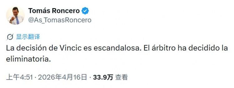 驰名皇马球迷兼《阿斯报》副主编的龙赛罗在赛后发推:“温契奇的判罚令东说念主气愤开云体育官方网站。裁判已预定了比赛恶果。”