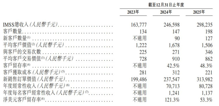 但让东谈主介意的是,哥瑞利与客户合作的沉稳性。招股书暴露,期内哥瑞利IMSS处事客户数目、总收入、与客户的往复次数、新销售订单价值均有所增长,客户留存率从2024年的42.5%飞腾至2025年的48.3%。但平均客户价值、平均客户往复价值均存在波动。与此同期,哥瑞利来自前五大客户的收入占比走低,五大客户也发生显著变化。