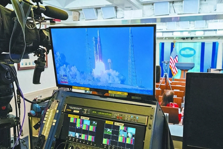 4月1日,华盛顿,白宫简报室的电视屏幕上正在播放“阿尔忒弥斯2号”任务辐射经由。(视觉中国)