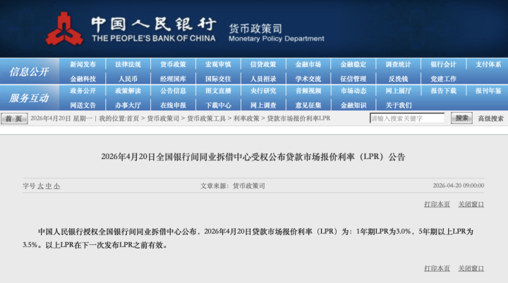 4月20日,最新一期贷款阛阓报价利率(LPR)报价定期出炉。中国东谈主民银行授权寰宇银行间同行拆借中心公布,2026年4月20日贷款阛阓报价利率(LPR)为:1年期LPR为3.0%,5年期以上LPR为3.5%,两个期限品种均与上月捏平。