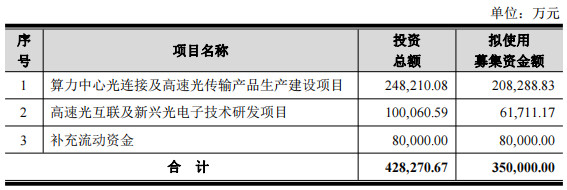 本次向特定对象刊行股票召募资金总额瞻望不升迁350,000万元(含350,000万元),在扣除刊行用度后本色召募资金净额将用于算力中心光聚拢及高速光传输居品分娩确立面貌、高速光互联及新兴光电子本领研发面貌、补充流动资金。