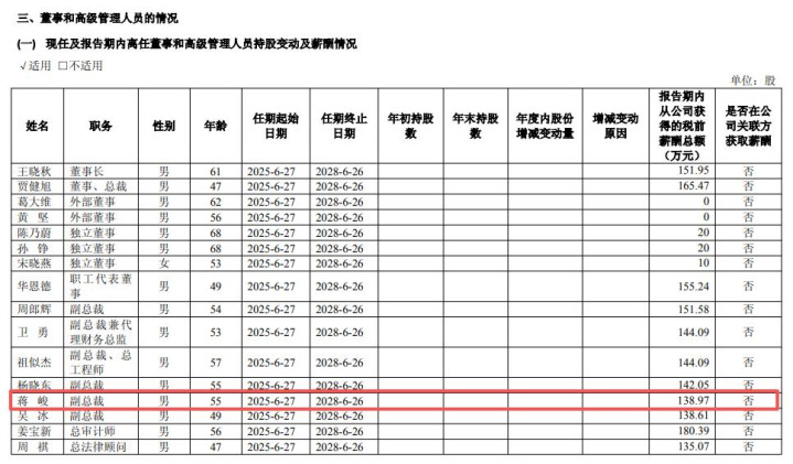 说明上汽集团年报,2025年蒋峻从公司取得的税前答谢总和为138.97万元,2024年的薪酬为84.34万元,薪酬高涨了54.63万元,是公司涨薪幅度最大的一位。