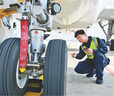 海南省海口市,好意思兰海外机场,工程师进行飞机航前查抄。