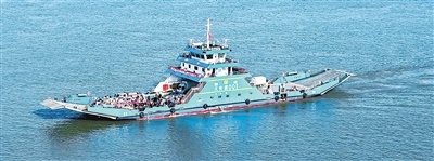 安徽省铜陵市,搭载乘客和车辆的轮渡前去位于长江江心洲的义安区老洲乡。