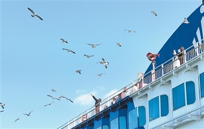 山东省烟台市,乘船前去大连的游客在船面上喂海鸥。